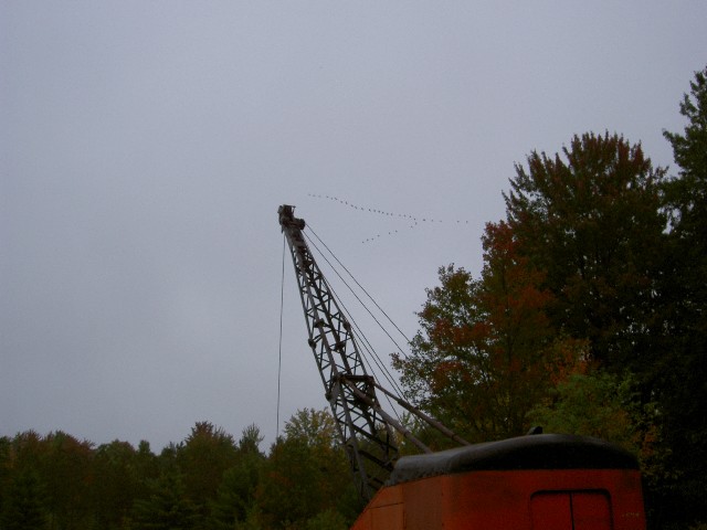Hard to see, but a flock of geese flying past the boom on Helga.